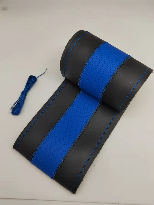 Калъф за волан за обшиване: -Калъфа е изработен от висококачествена перфорирана естествена кожа. -Размера на калъфа е с диаметър от 38см -Черен със синьо и син конецОбичайна цена 16.80лв/8.18€ -