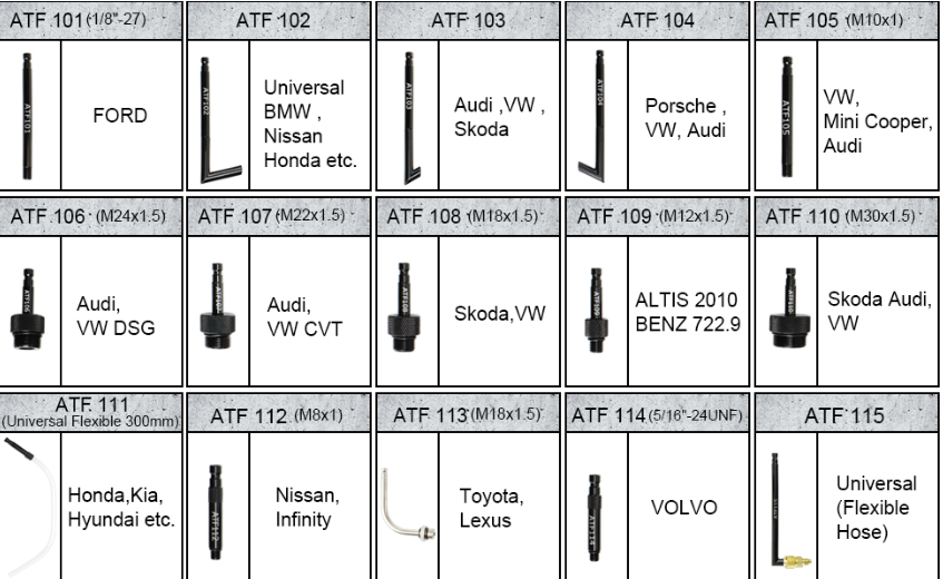 Този комплект инструменти за пълнене на двигателно масло ATF осигурява 15 БР. ATF адаптери, за да се поберат на различни модели превозни средства, да добавят масло от пробката за пълнене или да помогнат за изтласкване на трансмисионна течност в двигателя през дренажната пробка на трансмисионния съд. Всички метални адаптери от 15 PCS са маркирани с NO. и добре опакован в калъф, съвместим с Ford, BMW, Nissan, Honda, Audi, VW DSG, VW CVT, Skoda, Porsche, Benz, Mini Cooper, Kia, Toyota, Hyundai, Infiniti, VOLVO и Lexus.